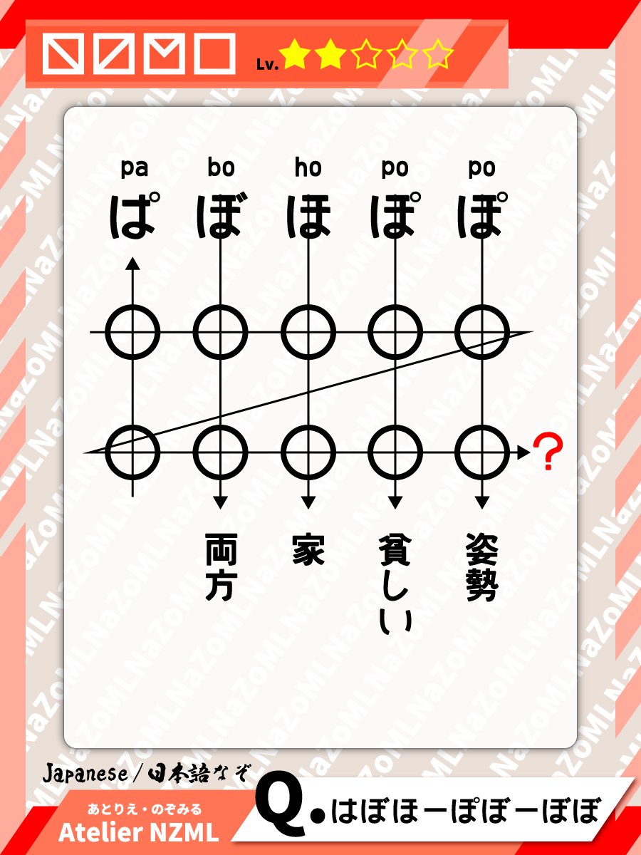 下にある4つの単語を英語にしてみると"both""home""poor""pose"となります。 1行目のひらがな5つもアルファベットに直し、〇にそれぞれアルファベットを当てはめると答えは「atmosphere」。